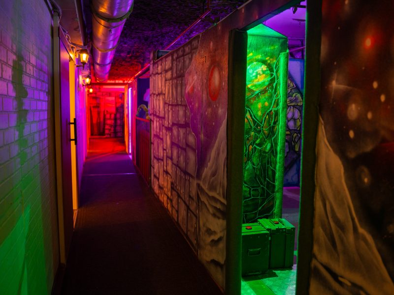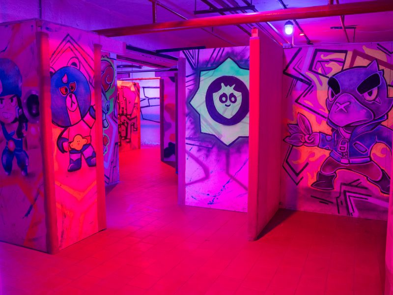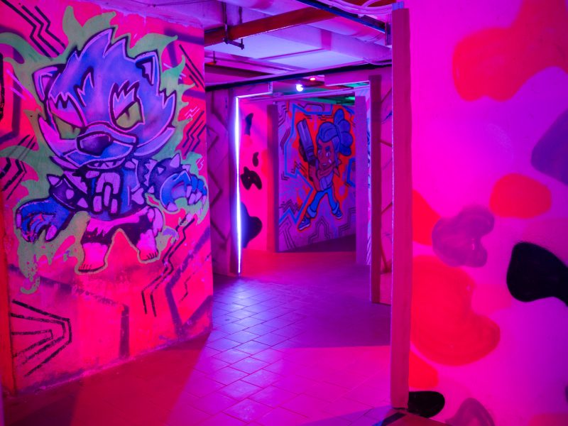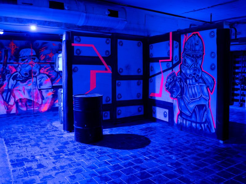 Просторные игровые зоны площадью около 400-500 кв.м позволяют устраивать сражения с участием до 100 человек, но и небольшие компании здесь чувствуют себя комфортно. Множество перегородок, лазов, коридоров и комнат делают игровой процесс еще более увлекательным. Яркие граффити на стенах, неоновая подсветка, железные бочки — благодаря этому создаётся эффект максимального погружения в сценарий.